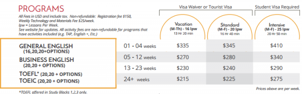 TOEFL - 주당 20 레슨 옵션 (주5교시) - IELTS, TOEIC, TOEFL, Grammar, Pronounciation, Conversation, etc. TOEIC - 주당 20 레슨 TOEIC - 주당 25 수업 : 20 lpw + Options Academic Year - 36 주 학습 + Term breaks, $ 10,260 USD Semester GAP - 23 주 공부 +1 주간 휴식, $ 7,245 USD