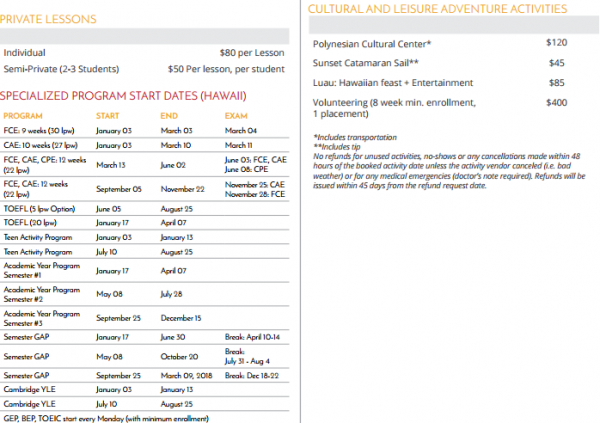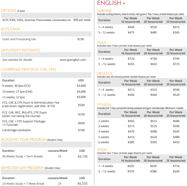 영어 + 서핑 (개인 레슨 - 주당 16 레슨) 영어 + 서핑 (개인 레슨 - 주당 20 레슨) 영어 + 서핑 (개인 수업 - 25 레슨 / 주 : 20 lpw + 옵션) 영어 + 훌라 - 주당 16 수업 영어 + 훌라 - 주당 20 레슨 영어 + 훌라 - 주당 25 레슨 : 20 lpw + 옵션 영어 + 우쿨렐레 - 주당 16 레슨 영어 + 우쿨렐레 - 주당 20 레슨 영어 + 우쿨렐레 - 주당 25 레슨 : 20 lpw + 옵션 영어 + 휘트니스 - 주당 16 수업 영어 + 휘트니스 - 주당 20 레슨 영어 + 휘트니스 - 주당 25 수업 : 20 lpw + 옵션 영어 + 요가 - 주당 16 수업 영어 + 요가 - 주당 20 레슨 영어 + 요가 - 주당 25 레슨 : 20lpw + 옵션