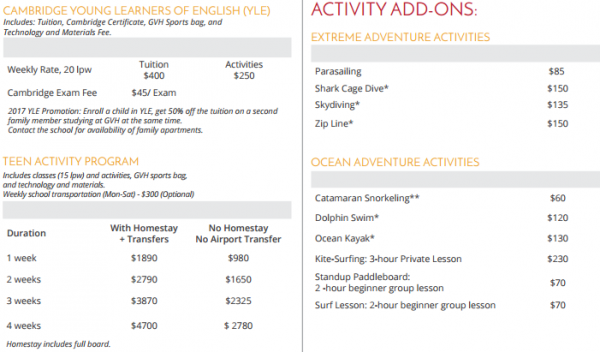 선택 활동 Parasailing Add Shark Cage Dive 스카이 다이빙 Add Zip Line Add Catamaran Snorkeling Add On Dolphin Swim 카약에 오션 카약 카이트 서핑에 3 시간 개인 레슨 Standup Paddleboard에 서핑 레슨 2시간 초급그룹 레슨 폴리네시아 문화센터 Add On Sunset Catamaran Sail Add Luau : Hawaian Feast + Entertainment .. 자원 봉사에 추가 (최소 8주 등록) 대학진학 프로그램 - 주당 25 레슨 : 20 lpw + Options