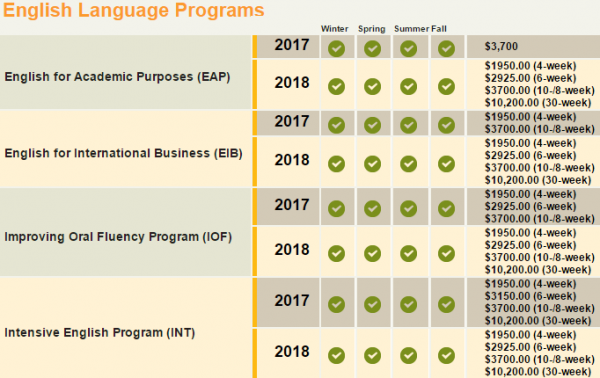 | 프로그램 | International Education Programs English Language Programs Intensive English Program (INT) 집중 영어 프로그램 (Intensive English Program : INT)은 1 년 내내 운영되며 대학이나 대학 진학을 목표로하는 학생들을 위해 디자인되었습니다. 100 (시작)부터 700 (고급)까지 7 단계의 풀 타임 이머젼 형식 프로그램입니다. 입학 레벨을 결정하기 위해 평가 테스트를 치르게됩니다. 각 레벨은 10 주 (특별 초강력 여름 8 주 세션 제외)이며 통합 교과 과정을 포함합니다. 레벨을 성공적으로 완료하면 다음 단계로 넘어갈 수 있습니다. 목표에 도달 할 때까지 원하는만큼의 세션을 유지하십시오. 더 오래 머무르면 더 많은 혜택을 누릴 수 있습니다.