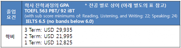 | 학비 | 3 Term :$29,935 2 Term :$21,995 1 Term :$12,825
